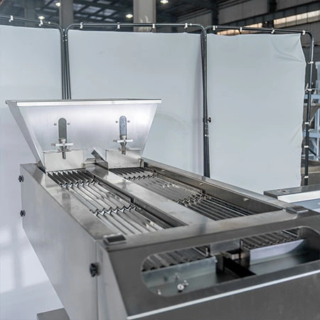 Препараты из верхнего бункера подаются в машину с помощью вибрационного питателя. Таблетки постепенно скользят по вибрационной желобчатой пластине, образуя непрерывную полосу и выстраиваясь в прямую линию к разгрузочному отверстию.